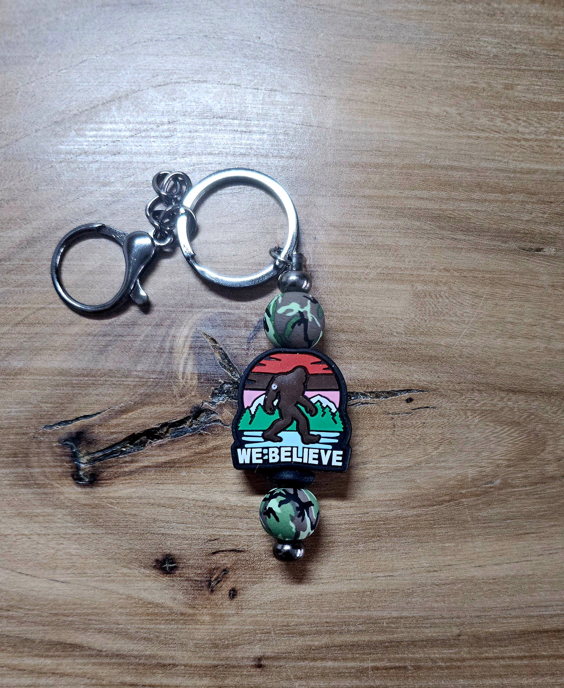 Step into the wacky world of urban legends with the Believe in Bigfoot Keychain. The arched bead showcases a woodsy motif with a walking Bigfoot, while the green camouflage accent beads add a touch of mystery. Get ready to make a statement and add some fun to your everyday carry!