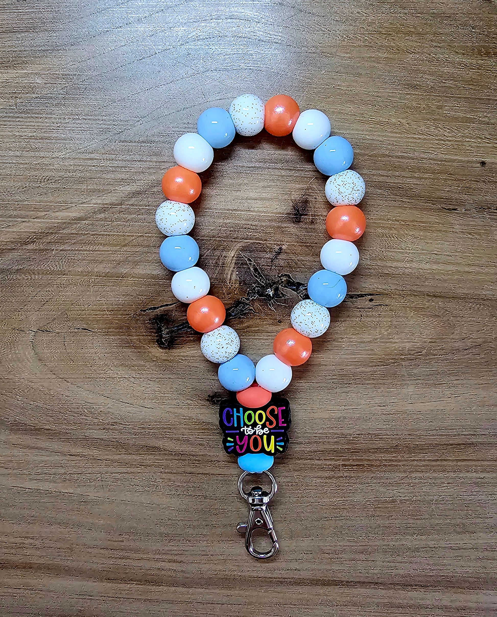 Elevate your style with the Choose to Be You Loop Wristlet. Featuring muted whites, burnt orange, and blues, this wristlet puts the focus on the brightness of the Choose to be you focal bead. Embrace your unique self with this chic accessory. Clip to any keychain or bag accessory!