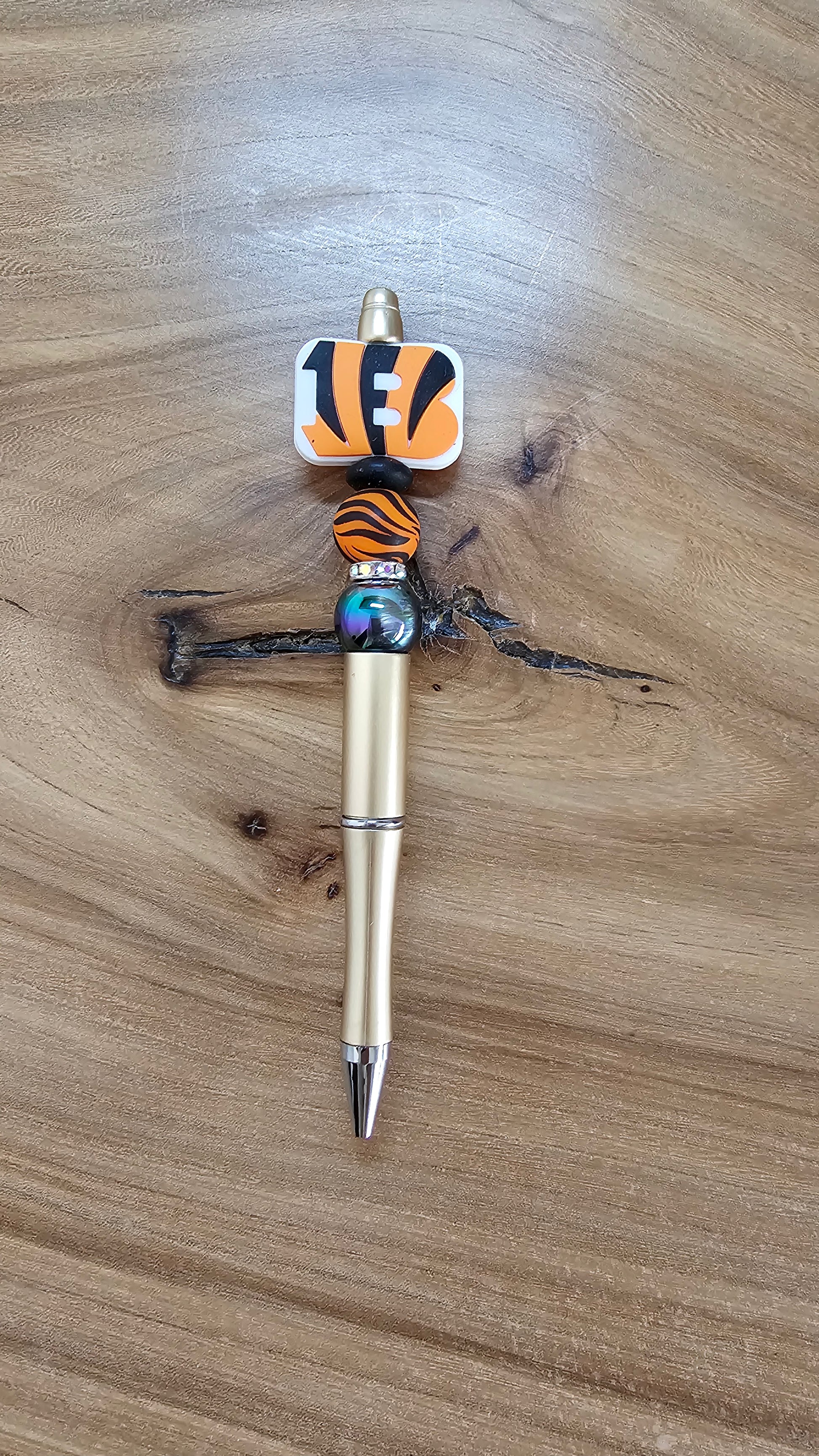 Score a touchdown with this quirky Cincinnati Bengals Gold Pen! Its "B" design and orange and black striped accent bead make it a playful addition to your desk. The gold pen adds a touch of sophistication to your writing. (Limited quantities, get yours before anyone else!)