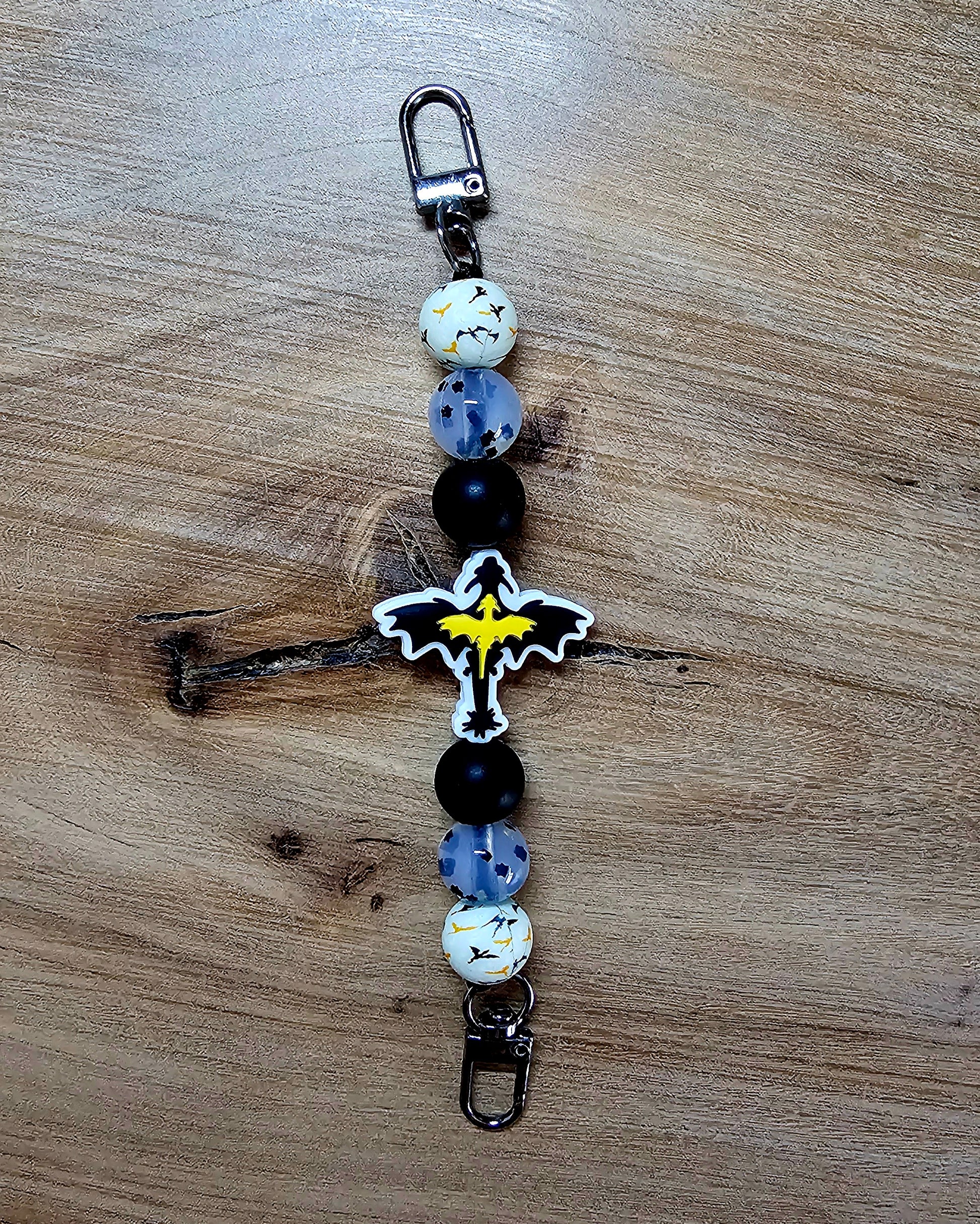 Upgrade your e-reader or Kindle with the Fourth Wing Interchangeable Strap. With unique Fourth Wing round accent beads, clear beads with black star accents, and a black and yellow Fourth Wing focal bead, you'll be flying through your reads. Easy clip connections (only an extra $2!) make it a breeze to attach to any device.