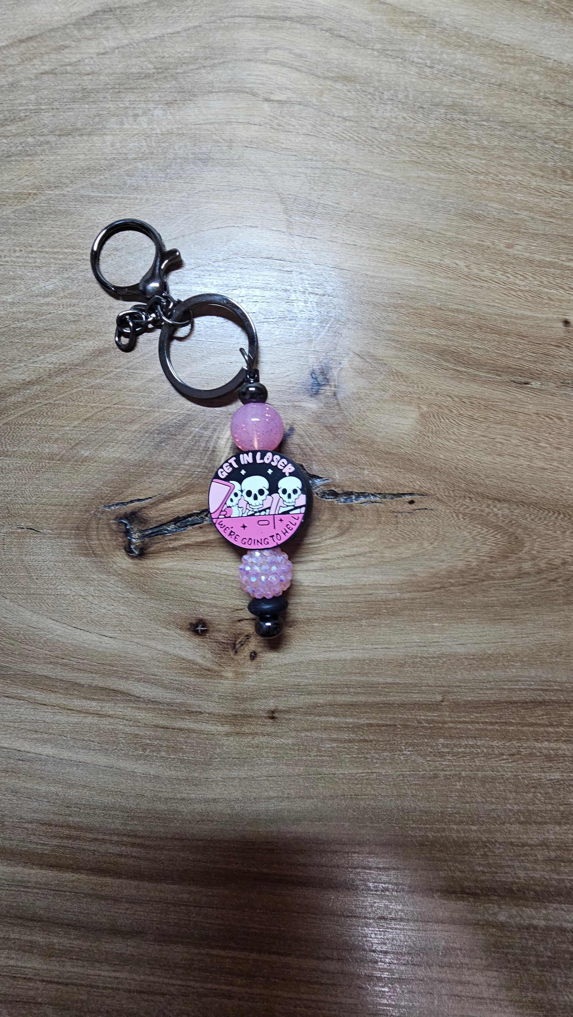 Take a ride on the wild side with the "Get in Loser, We're Going to Hell" keychain. Featuring a Skeleton Crew design in eye-catching pink and black motif, this is the perfect gift for your ride-or-die friends. Don't miss out on this quirky and playful accessory!