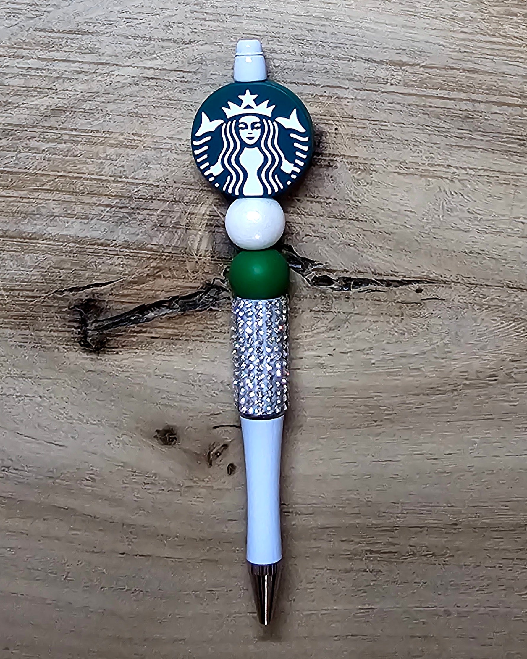 This handcrafted beaded pen features a green and white color palette with a coffee-themed focal bead, paired with a sparkling rhinestone spacer for extra shine. Finished with a smooth white pen base, it’s both functional and fun.