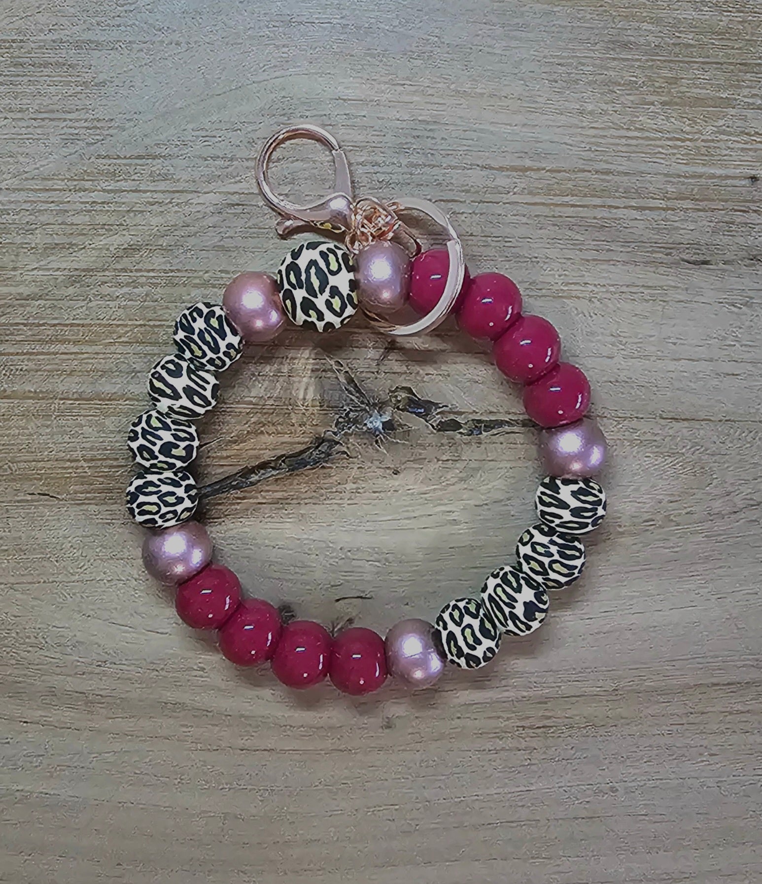 Leopard Print Beaded Wristlet Keychain – Cranberry & Rose Gold