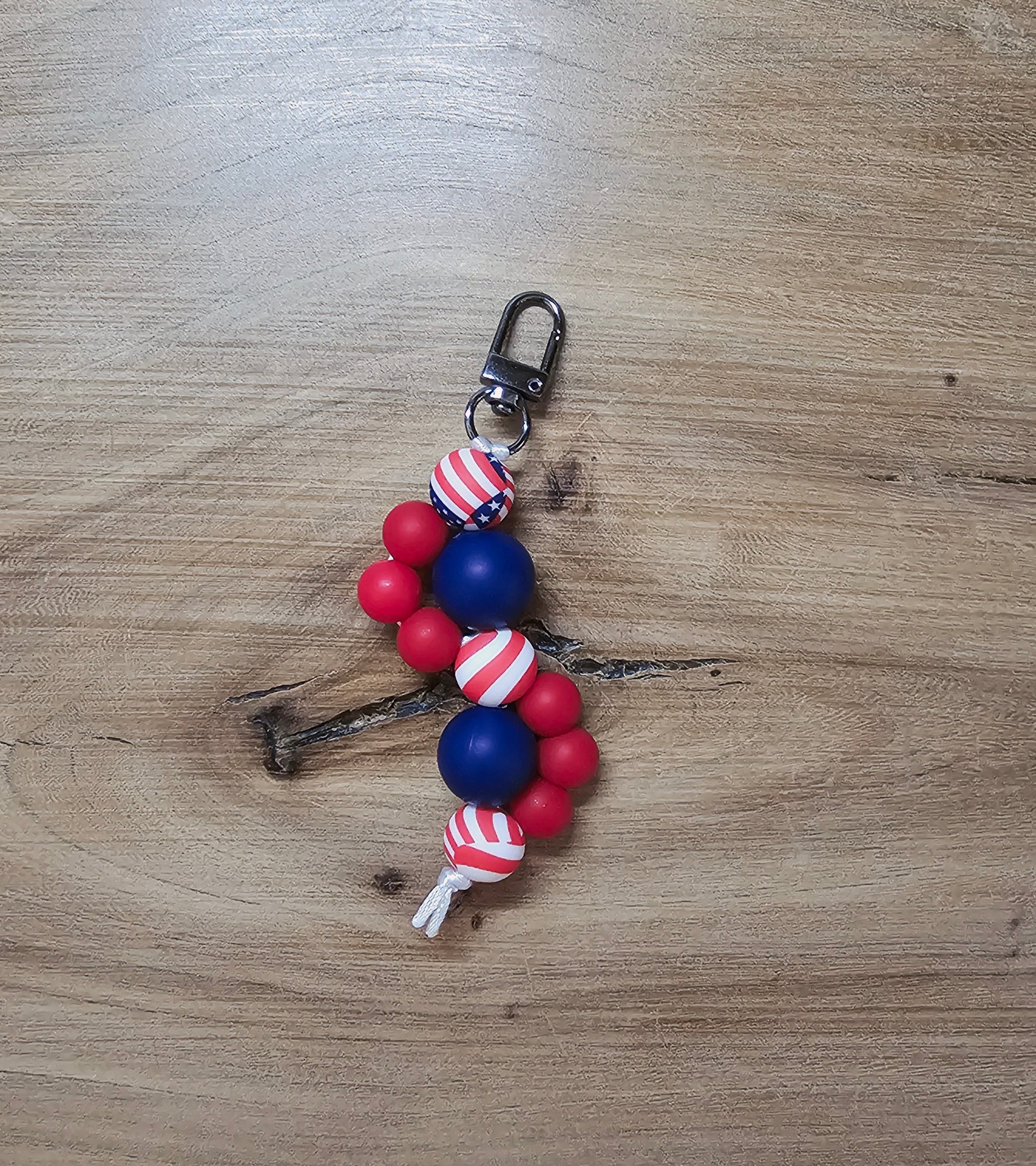 Add a touch of patriotism to your everyday with our Red, White and Blue Wave Keychain. Crafted with USA flag accent beads and highlighted with red accents along the edges, this keychain is a must-have for any proud American. Show off your love for your country with this unique and stylish accessory.