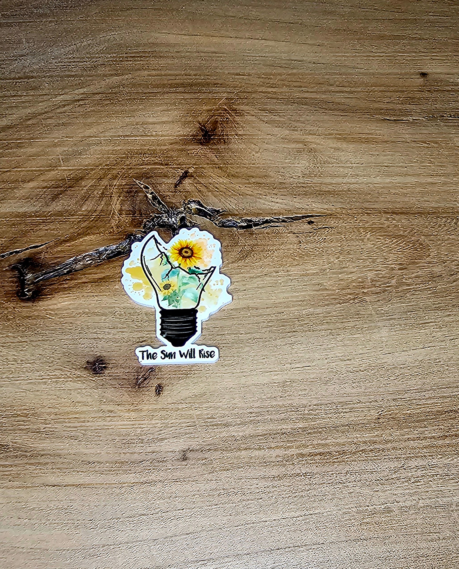 The Sun Will Rise Flatback is a versatile and unique accessory to add to any badge reel. Its intricate broken light bulb design is accented with a sunflower and sunrise, representing hope and resilience in mental health awareness. Add a touch of positivity and style to your daily wear.