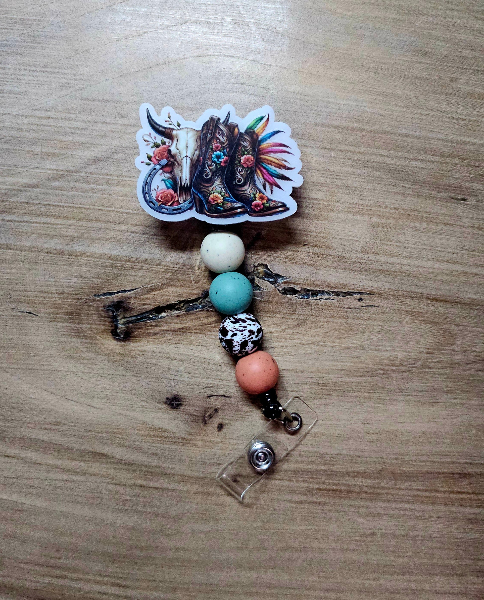 Yeehaw! Wrangle in your workday with These Boots Badge Reel. The cowgirl boots flatback accent and cowhide design add a touch of western charm, while the turquoise and brown accent beads keep it stylish. No more boring lanyards, this reel is a rodeo of fun!