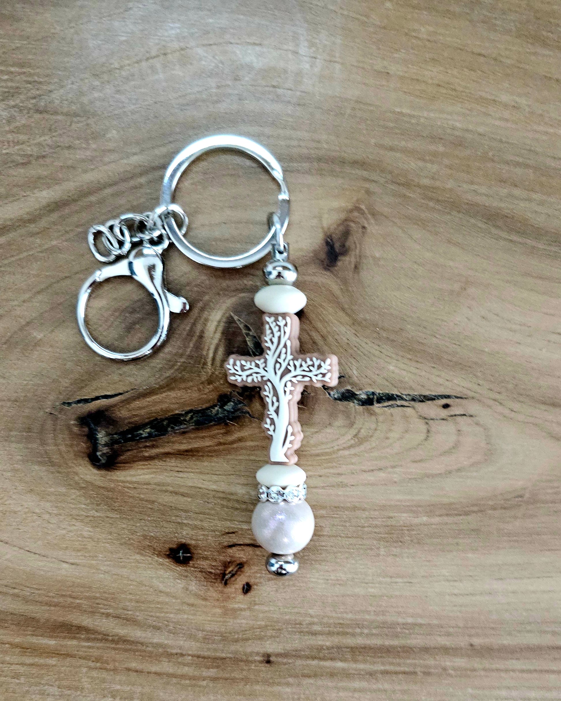 The Tree of Life Cross Keychain is a beautifully crafted accessory that features a tan cross with a striking tree of life design. Accented with a delicate light pink iridescent bead, this keychain adds a touch of elegance to any set of keys. Keep your faith close at hand with this expertly designed keychain.